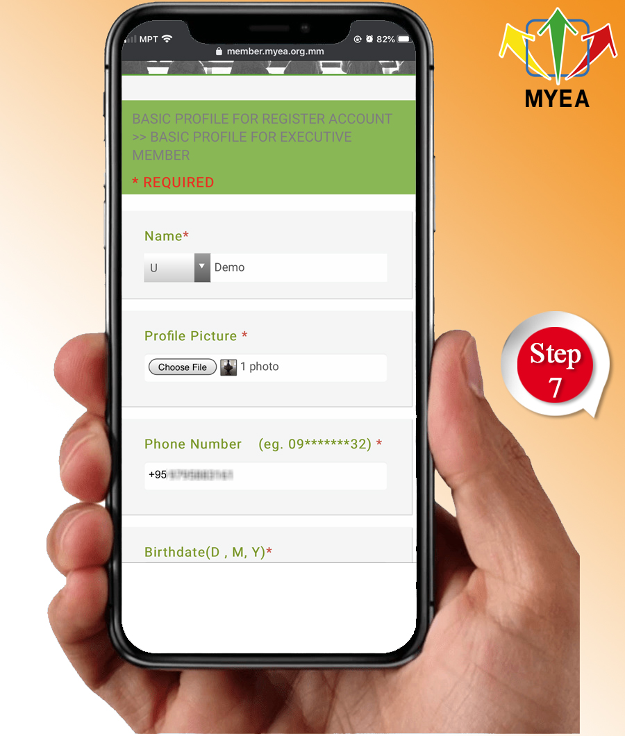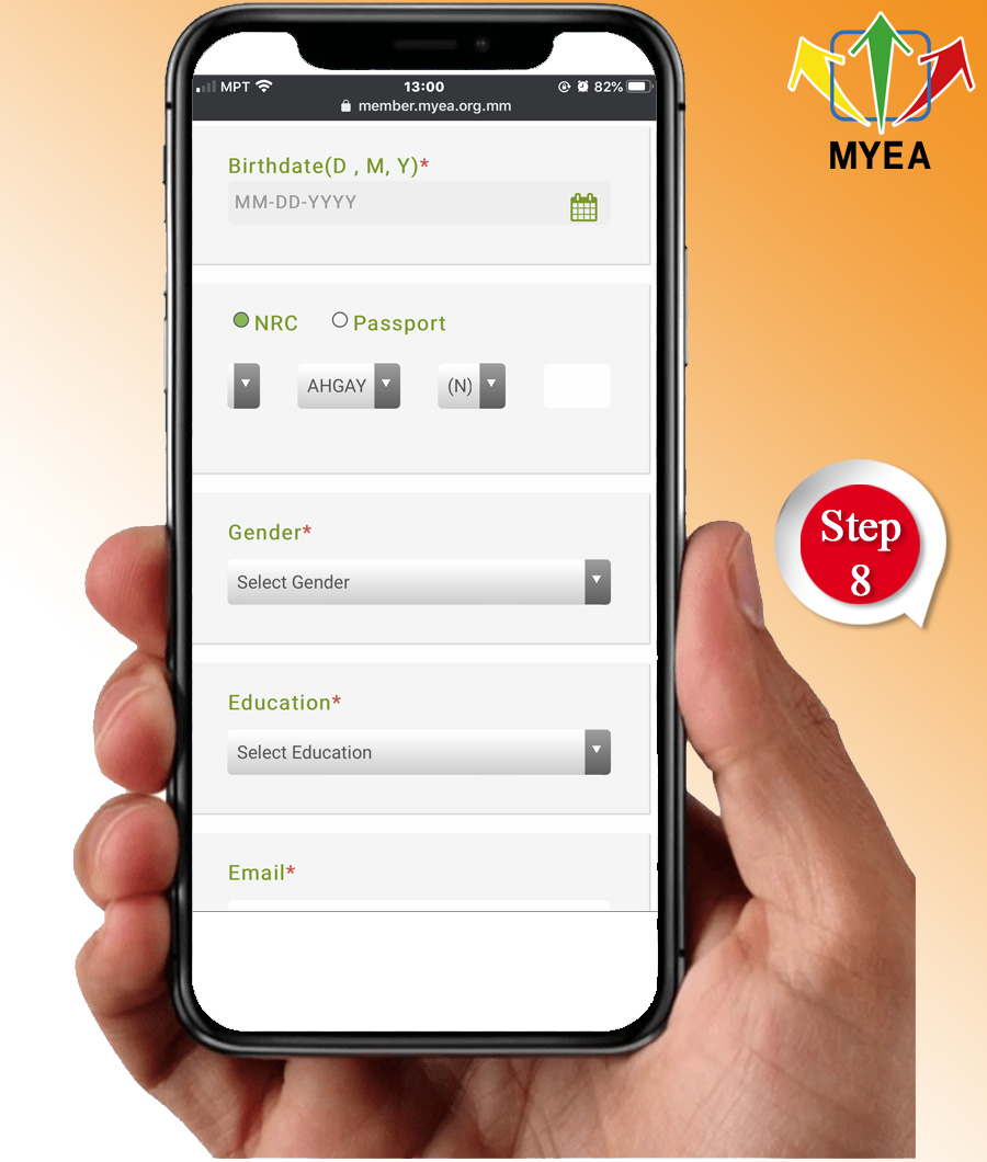 - Step (5) You must pick the membership type and region (an organization that you prefer). If you select Yangon region, you will automatically become a member of Yangon Region Young Entrepreneurs Association (YRYEA). If you choose Mandalay region, you will automatically be a member of Mandalay Region Young Entrepreneurs Association (MRYEA). Members are granted as Dual Member for both MYEA and its esteemed States and Regions Entrepreneurs’ Association.